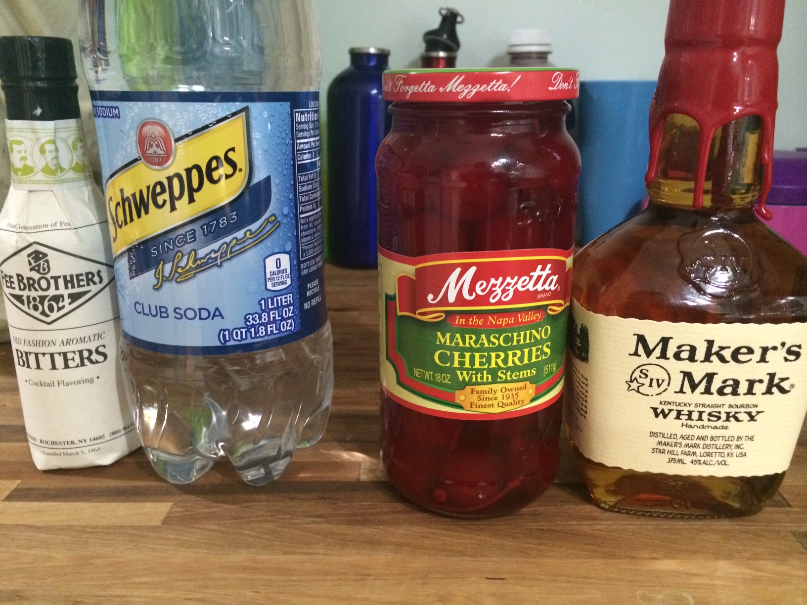 I don’t think they’re technically Old Fashioned glasses, but they were my grandmother’s, which makes them old fashioned. 🙂 The recipe calls for you to muddle the sugar, cherry, orange rind, and club soda together. I didn’t have a muddler (and the club soda exploded when I opened it) so I improvised my smashing everything together with a spoon.